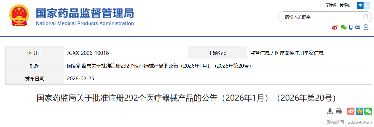 2026年1月,国家药监局共批准注册医疗器械产品292个。其中,境内第三类医疗器械产品251个,进口第三类医疗器械产品23个,进口第二类医疗器械产品15个,港澳台医疗器械产品3个(具