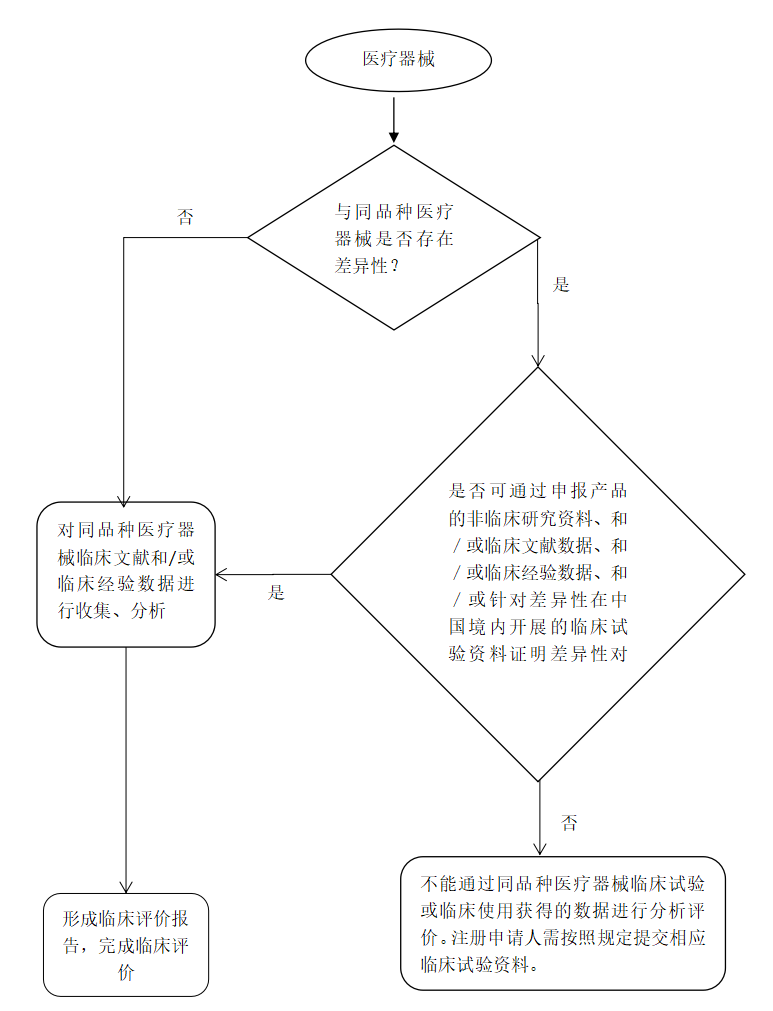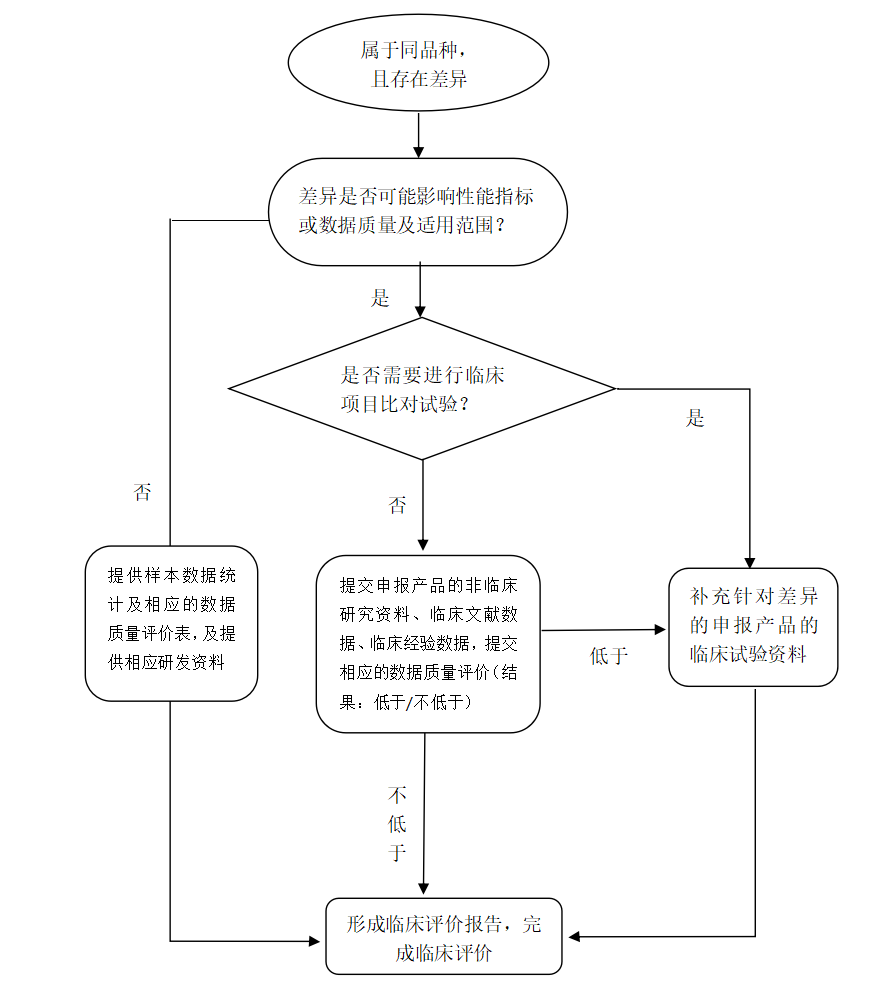 根据《医疗器械临床评价技术指导原则》中规定的评价路径可知,拟申报产品与对比产品关系有两种,或为同品种产品,或为非同品种产品,如为同品种产品,还需对两者之间的差异是否对产品安全性、有效性产生不利影响进行进一步评价。