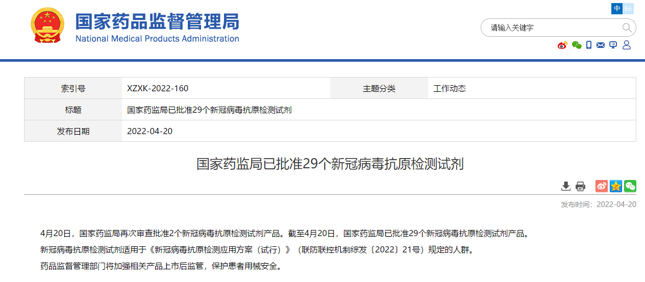 4月20日,国家药监局再次审查批准2个新冠病毒抗原检测试剂产品。截至4月20日,国家药监局已批准29个新冠病毒抗原检测试剂产品。