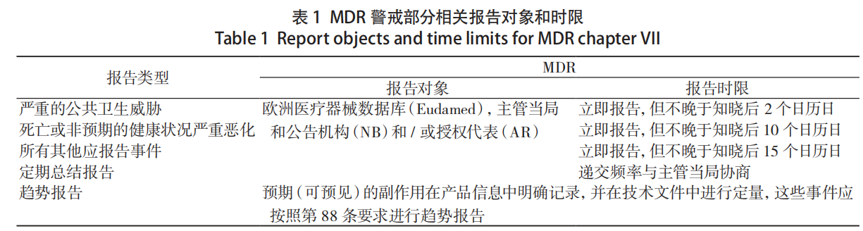 MDR 关于警戒部分涉及的内容包括:严重不良事件和 FSCA 报告、趋势报告、严重不良事件和FSCA 分析、警戒数据分析、实施法案以及上市后监督和警戒电子系统,相关报告对象和时限见表 1。