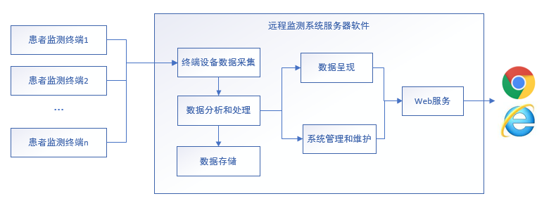 远程监测系统一般由患者监测终端设备、监测软件、网络设备组成。