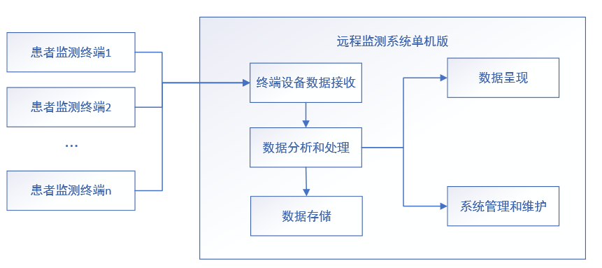 申请人需在综述资料中明确产品的体系结构,主要功能模块,如生理信号采集模块、数据存储模块、数据分析模块、数据呈现模块、系统管理和维护模块等。产品的体系结构应该给出示意图,示意图应包含主要功能模块和模块之间的关系。需提供监测软件的部署形态说明。说明是单机部署还是服务器客户端部署。