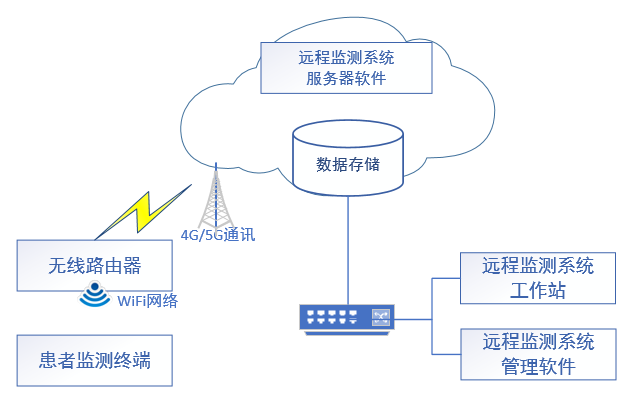 该示例中,患者监测终端,通过WiFi连接无线路由器,无线路由器通过网络连接到云端的远程监测服务器软件;服务器软件将数据进行存储。远程监控系统工作站、远程监测系统管理软件,通过有线网络连接到云端的远程监控服务器软件,用于实时监测,系统管理等功能。