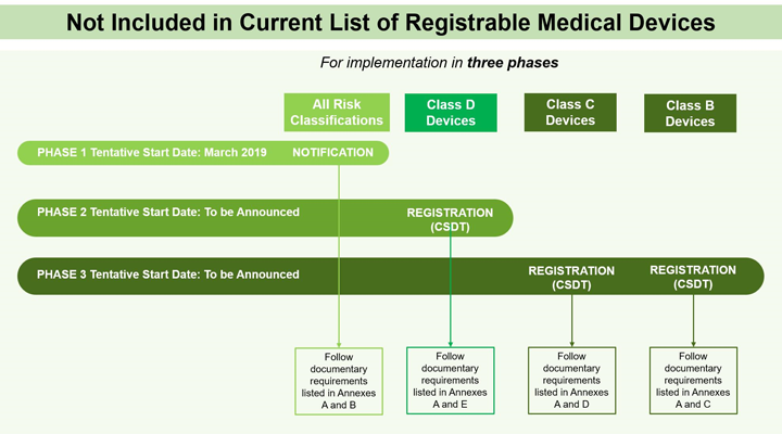 2019年4月1日实施的新规定要求风险A类医疗器械获得医疗器械通知证书(CMDN),风险B,CD类医疗器械取得医疗器械注册证(CMDR)只有这样,我们才能在菲律宾进口并投放市场。新规定将分阶段实施: