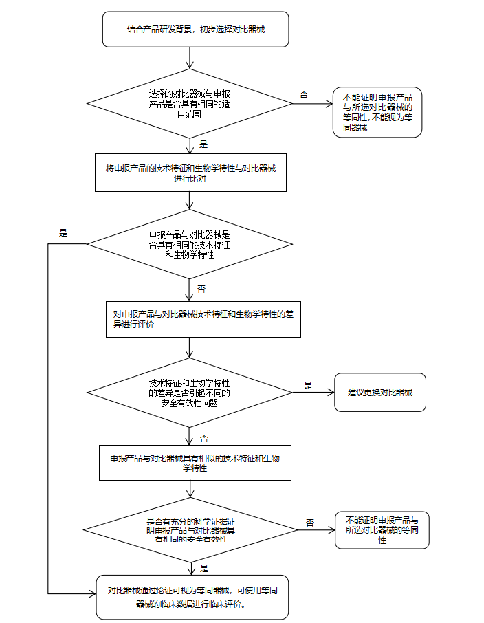 2、若通过同品种医疗器械的临床数据进行申报产品临床评价的,应当符合《医疗器械临床评价技术指导原则》、《医疗器械临床评价等同性论证技术指导原则》等文件的要求。建议申请人按照等同性论证流程图所述的路径进行等同性论证,若能建立申报产品与对比产品的等同性,可使用等同器械的临床数据进行临床评价,并按照《医疗器械注册申报临床评价报告技术指导原则》的要求完成临床评价报告。