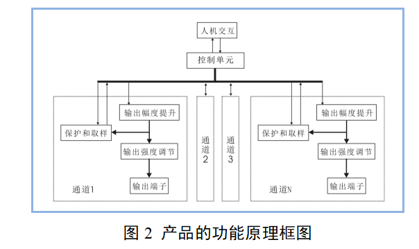 产品从内部功能原理来看,是一台单通道或多通道,带输出幅度调节装置的脉冲信号发生器,产品的功能原理框图见图2。