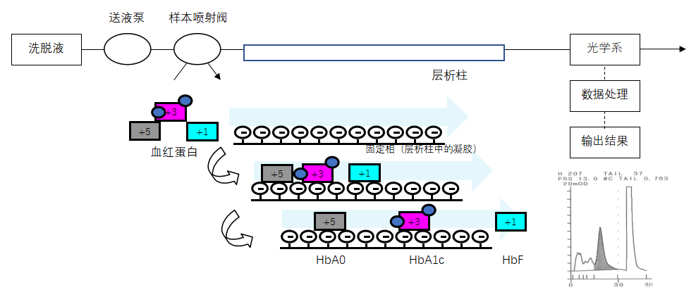 通常基于HbA1c与其它血红蛋白组分(HbA1a、HbA1b、HbF、HbA0)所带电荷不同,在一定的缓冲液离子强度下可与色谱柱(层析柱)树脂表面偶联的离子基团不同程度的结合,从而将HbA1c与其它组分区分开而分离,检测从色谱柱(层析柱)洗脱各成分的吸光度,根据每个峰值下的面积计算HbA1c占总Hb的比例,从而获得峰鉴别和含量。