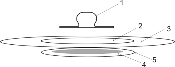1)电极扣,2)胶带,3)基衬材料,4)导电介质,5)防粘膜。