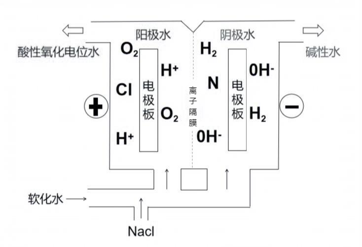隔膜式电解槽是酸性氧化电位水生成器的核心部件,它是由框架、一定数量的电极板、离子隔膜按照规则组合,经封装后形成的有进、出口的封闭式器件。常见的隔膜式电解槽有二室型电解槽和三室型电解槽。二室型电解槽是阳极与阴极间利用一片隔膜,将电解槽分成2个小间,低浓度氯化钠电解溶液进入电解槽后,阳极产出酸性氧化电位水,阴极产出碱性电位水。三室型电解槽是阳极与阴极间利用两片隔膜,将电解槽分成3个小间,在中间的小间里加入高浓度的食盐水,在两侧的小间内通上软水,在阳极产出酸性氧化电位水,阴极产出碱性电位水。电解槽其电极板、离子隔膜的大小、电极板的数量均影响生成量的大小,一般电解槽电极板、离子膜的面积越大、电极板的数量越多,制水生成量越大。注册申请人应明确电解槽腔室设计、电极板基材、涂层材料、隔膜类型,以及不同出水量的电解槽差异。
