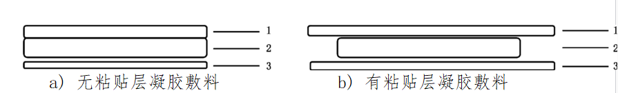凝胶敷料可按形状分为无定形和定形。无定形结构的凝胶敷料为凝胶状,含水量较高,重量百分比可达到80%。定形结构的凝胶敷料为片材形,分为无粘贴层型(凝胶敷芯)和有粘贴层型(敷芯一面覆有聚氨酯薄膜或无纺布基材,另一面为可去除的离型层),其常见结构如图1所示。无保护层的凝胶敷芯亦可单独使用,用绷带或胶带等进行固定。