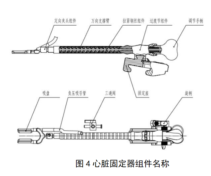 心脏固定器产品通常分为吸引固定型和机械固定型。一般由调节手柄、固定卡座、万向支撑臂、吸盘、负压吸引管组成,也可由压脚叶(或吸脚固定座、吸脚)、负压连接管、三通阀、定向夹头组件、调节臂、固定座、调节手柄、旋柄、内穿拉紧钢丝组件组成。