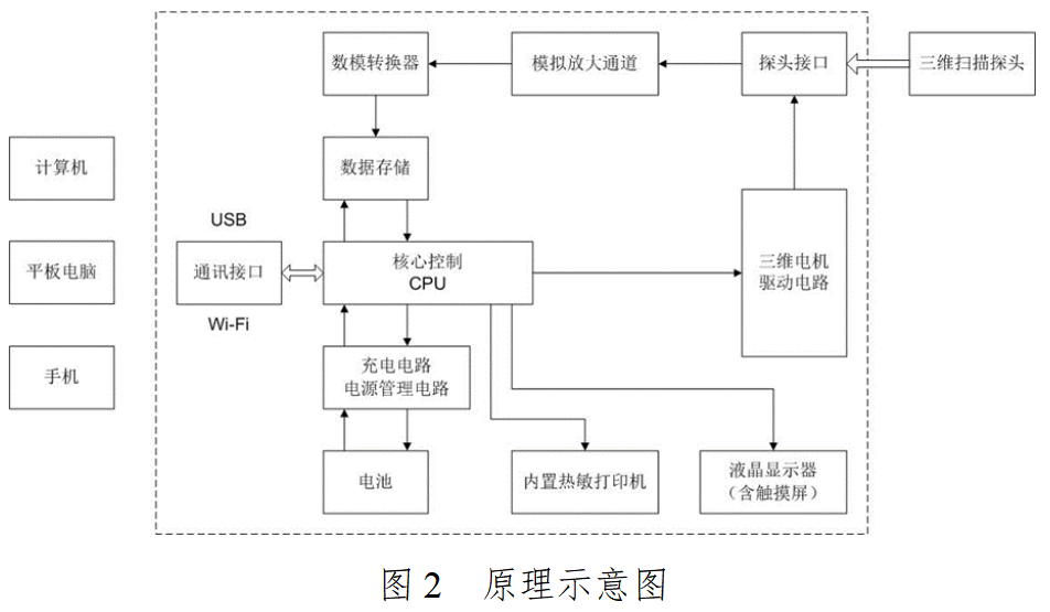通常由主机、超声探头、软件组件(如适用,明确发布版本)、电源线(如适用)、可充电电池(如适用)、充电器(如适用)和选配件(如通用计算机平台、打印机等)组成。手持式产品一般采用主机、探头一体设计,并通常带有可在通用计算机平台或智能终端进行显示、处理和存储的应用软件。原理示意图如图2所示。