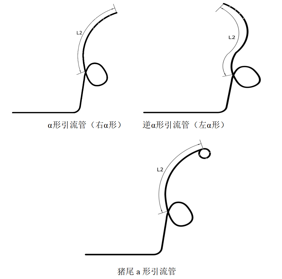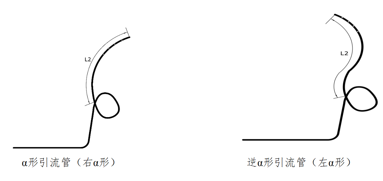 例:引流管有α形引流管(右α形)、逆α形引流管(左α形)、猪尾α形等多种技术结构(如图3所示)。在上述三种类型产品预期用途一致的情况下,如猪尾α形引流管结构最复杂,生物、化学、物理等性能指标涵盖其他两种产品的指标,能够代表其他产品的安全性、有效性,则可以确定猪尾α形引流管为这三种产品的典型产品。