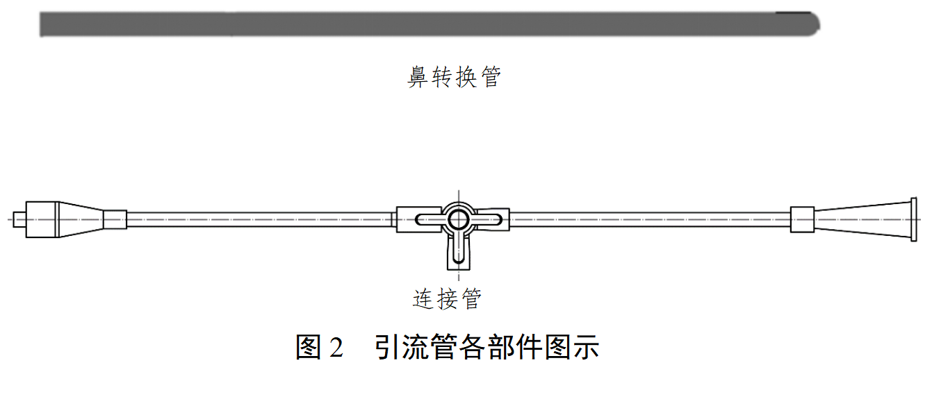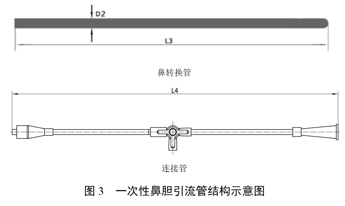 经鼻胆汁外引流管由管体和接头组成,有的根据需要配有鼻转换管、连接管或三通阀、矫直管等,鼻转换管用于将引流管进行口鼻转换,连接管或三通阀起连接引流管和引流袋作用,矫直管用于矫直产品,方便产品进入内窥镜。