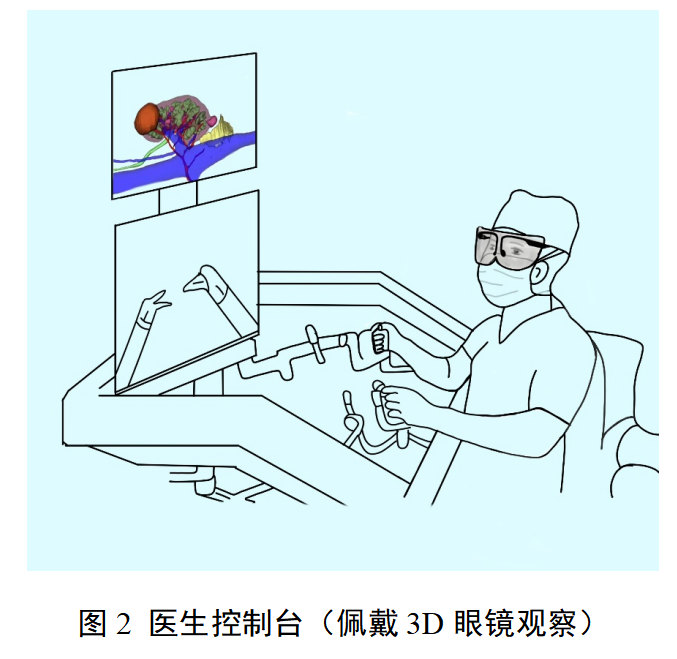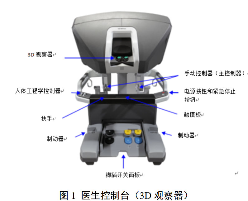 外科医生位于医生控制台,通过使用手动控制器(主控制器)和一组脚踏板(如有)来控制手术器械和内窥镜(如有)的所有运动。内窥镜用于采集手术区域的立体图像,外科医生在3D观察器(图1)或者佩戴3D眼镜在显示屏(图2)上观察患者解剖和手术器械的视图及其他用户界面特征。本文图示仅为示例,实际不同厂家结构设计有所不同。