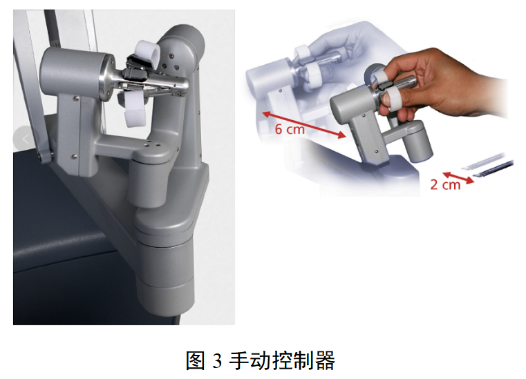医生控制台最主要的控制部件为手动控制器,如图3所示。手动控制器用以捕捉外科医生的手部或者手臂动作,例如手动控制器平移6cm,终端器械移动的距离为2cm,该比例可根据实际手术情况进行调节(如有)。