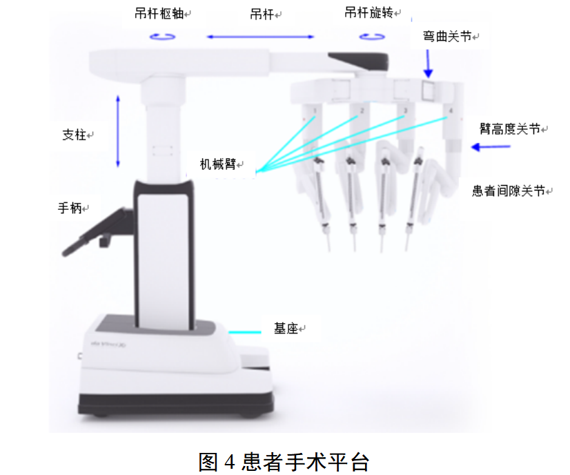 患者手术平台位于手术床旁,包含分体或单体的多个机械臂,机械臂上可以连接内窥镜(如有)和手术器械。内窥镜用于提供患者解剖结构的3D视图。手术器械由医生通过医生控制台进行控制,实现手术操作。不同厂家患者手术平台的结构、设计和各部分的叫法可能有所差异,但基本原理和功能类似。
