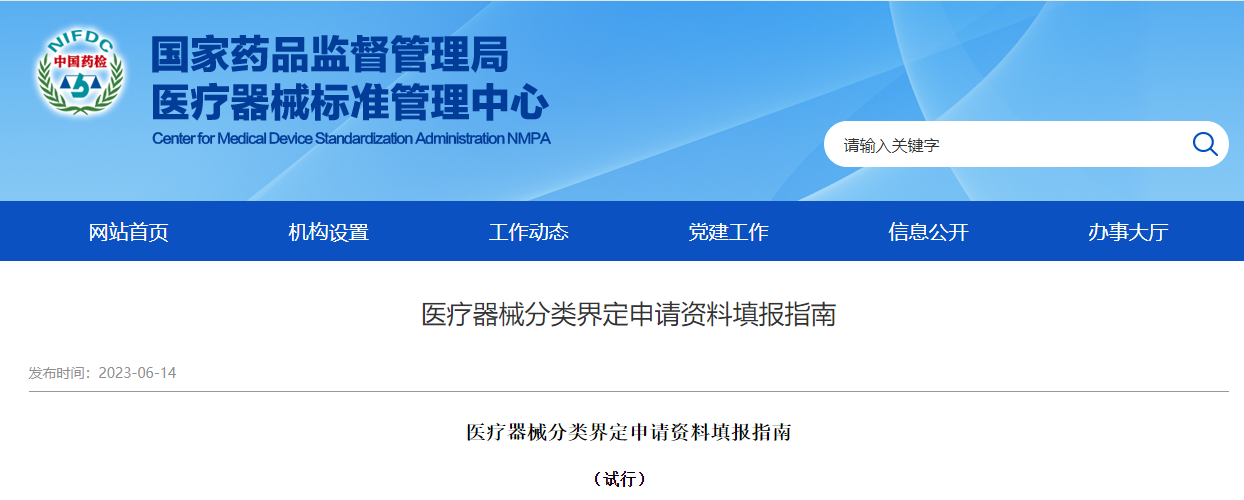 申请人登陆“中国食品药品检定研究院(国家药监局医疗器械标准管理中心)”网站(https://www.nifdc.org.cn),依次进入“办事大厅”--“医疗器械标准与分类管理”--“医疗器械分类界定信息系统”页面,在线提交申请资料。
