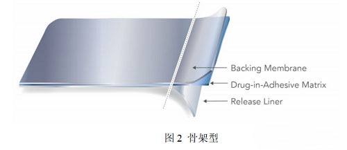 骨架型TDS含有一种或多种活性成分,这些成分溶解或部分悬浮在各种成分的混合物中,包括粘合剂、促渗透剂、柔软剂和防腐剂。制备骨架型TDS通常使用溶剂、水凝胶或热熔法。图2展示了骨架型TDS的示意图,尽管骨架型TDS可能还包括额外的层和更复杂的设计。