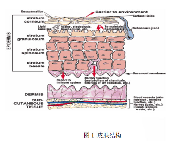 人体皮肤是一种高效的屏障结构,图1显示了皮肤的结构[4]。它既能够防止体内水分过度流失,又能够阻止外部生物的侵入。