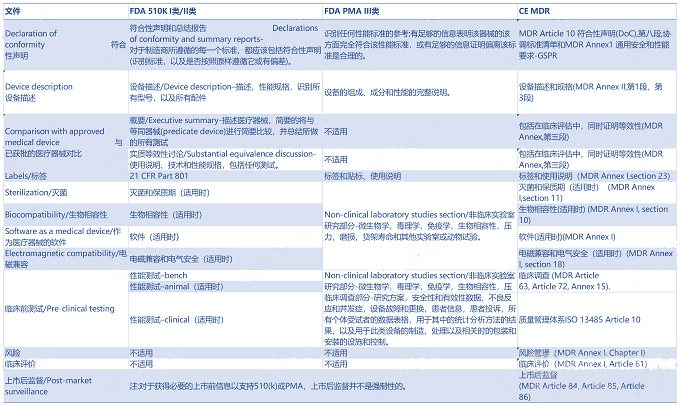 注:本表只考虑与医疗器械直接相关的文件,不包括申请 FDA 和公告机构所需的任何行政文件。