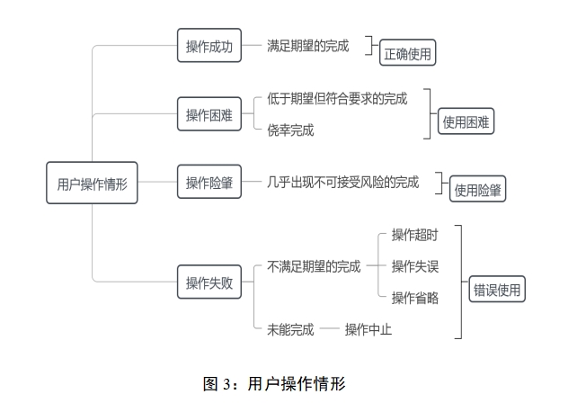 如图3所示,用户实际使用医疗器械的操作情形较为复杂,本指导原则根据操作任务完成程度将其分为操作成功、操作困难、操作险肇、操作失败。