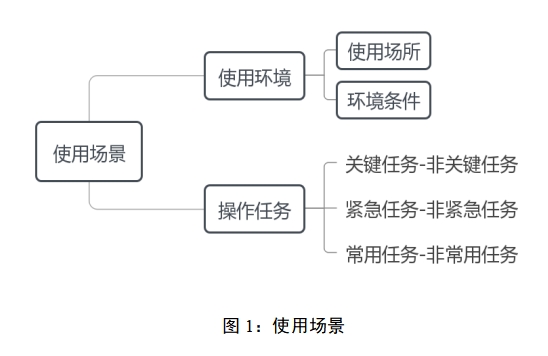 如图1所示,使用场景是指注册申请人所规定的医疗器械实际使用的场景因素,包括使用环境和操作任务。使用环境是指用户操作医疗器械的实际环境,又可分为使用场所、环境条件,其中使用场所包括门诊室、急诊室、手术室、病房、救护车、家庭、公共场所等情况,环境条件包括空间、照明、温度、湿度、气压、洁净度、噪声、振动、辐射等情况。操作任务是指用户操作医疗器械以实现特定目标的行动或行动序列,本指导原则重点关注医疗活动相关操作任务,暂不考虑清洁、运输、安装、维修、处置等操作任务(医疗器械安全标准若有相应要求除外),待时机成熟时纳入考量。不过注册申请人需考虑全部操作任务的人因设计要求。