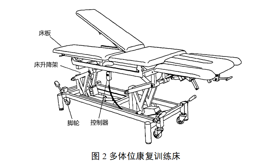 多体位康复训练床通常由两段以上床板、机械支撑部件、电动控制装置、脚轮等组成。具体产品结构示意图见图2。