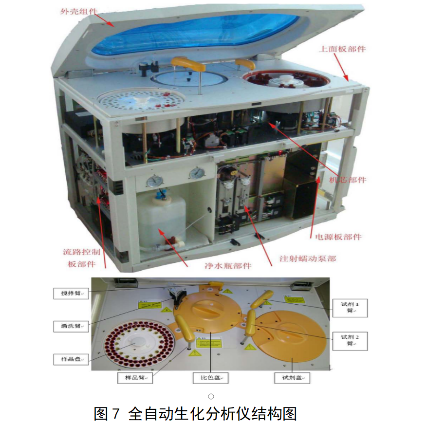 全自动生化分析仪的结构一般按吸收池的型式分为分立式或流动式;按单色装置分为滤光片式(干涉滤光片或吸收滤光片)、光栅式、固体发光器件或其他等效方式;按光路型式分为前分光或后分光;按比色容器类型分为循环使用式或一次性使用式。仪器组成一般由光电比色部分、进样系统、控制单元、数据处理系统、清洗系统等组成。产品图示举例: