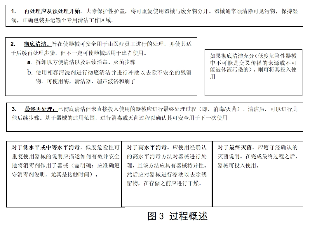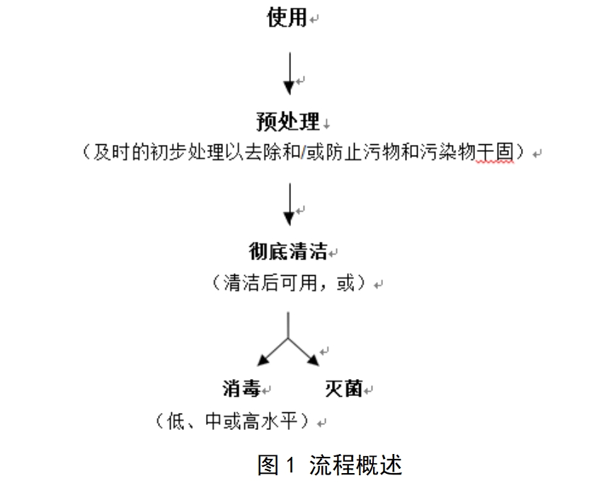 下图所示为一般再处理步骤的过程概述,对可重复使用医疗器械进行适当的处理和再处理以供下一次使用。