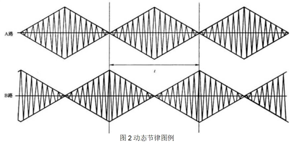 符合动态干扰波形的特点是:A路电流逐渐增强的同时E路电流逐渐滅弱,A路电流达到最大时B 路电流减到最小,而后反之,如此反复,形成周期为f的节律性变化"即为动态节律。示洌波形如图2
