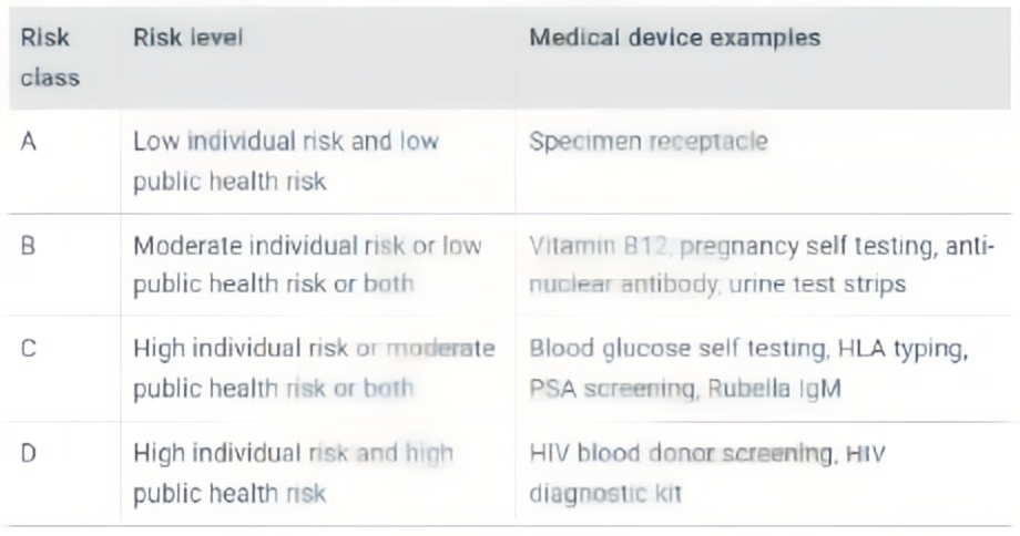 医疗器械的风险分类取决于产品的设计和预期用途。新加坡将医疗器械(包括IVD)根据风险由低至高分为A、B、C、D四类。A类风险最低,D类风险最高。