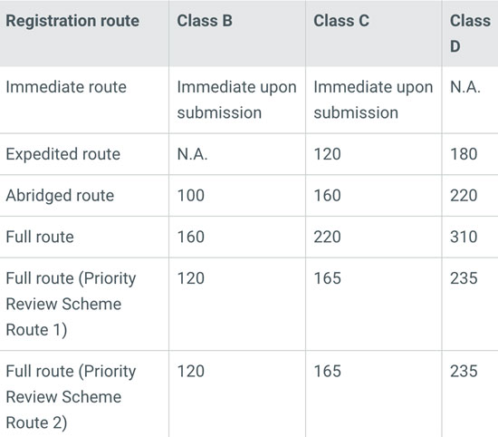 不同分类及不同注册路径所需要的时间及费用不同。例如A类产品可以免予注册,时间最短、费用也最低。而对于高风险产品,注册时间可能需要200-300天,官方费用根据注册的路径不同大约需要1-2万美元。