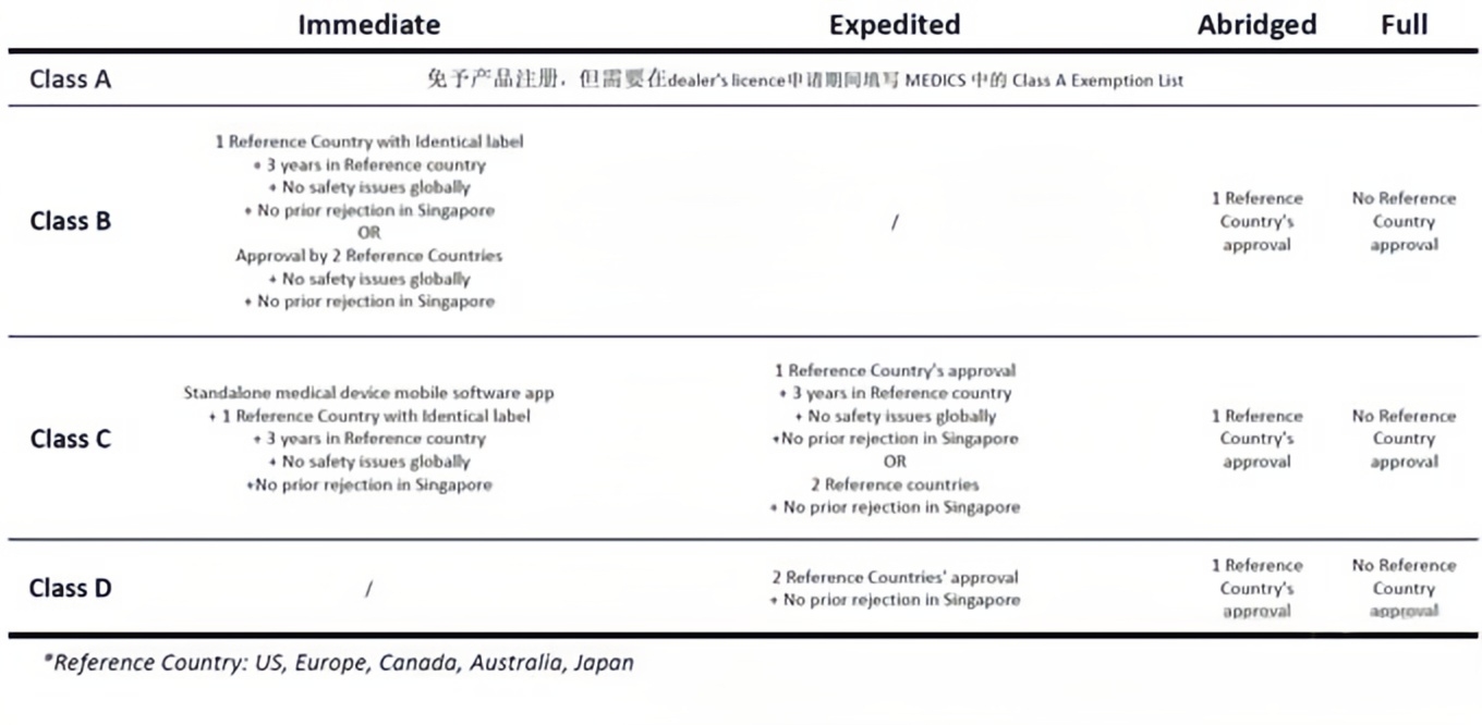 根据产品风险分类以及该产品在参考国家的上市情况,总共有四种不同的注册路径:Immediate、Expedited、Abridged以及Full。总体上来说,同一产品在越多的参考国家获得上市许可,则在新加坡注册的流程越简单快捷。