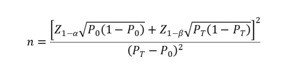 公式中,n为样本量;Z1-α、Z1-β为显著性水平和把握度的标准正态分布的分数位,P0为评价指标的临床可接受标准,PT为试验体外诊断试剂评价指标预期值。