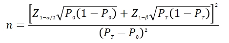 公式中,n为样本量;Z1-α/2、Z1-β为显著性水平和把握度的标准正态分布的分位数,P0为评价指标的临床可接受标准,PT为试验体外诊断试剂评价指标预期值。