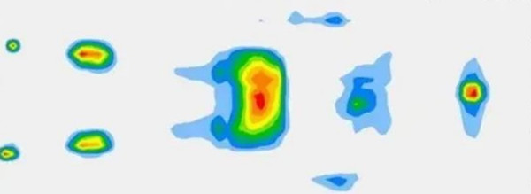 压力分散效果: 使用高科技的压力测试毯,普通床垫在压疮高危区域呈现红色,表示高压力;而静态防压疮床垫呈现安全的蓝绿色,表明良好的压力分散效果。