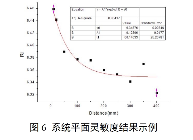 对每个探头,对应每种准直器,计算系统平面灵敏度;并根据不同距离测试的灵敏度结果,得到拟合公式,见图6,计算给出100mm处的透射分数。