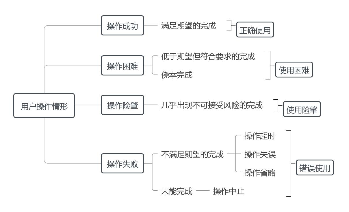 如图3所示,用户实际使用医疗器械的操作情形较为复杂,本指导原则根据操作任务完成程度将其分为操作成功、操作困难、操作险肇、操作失败。