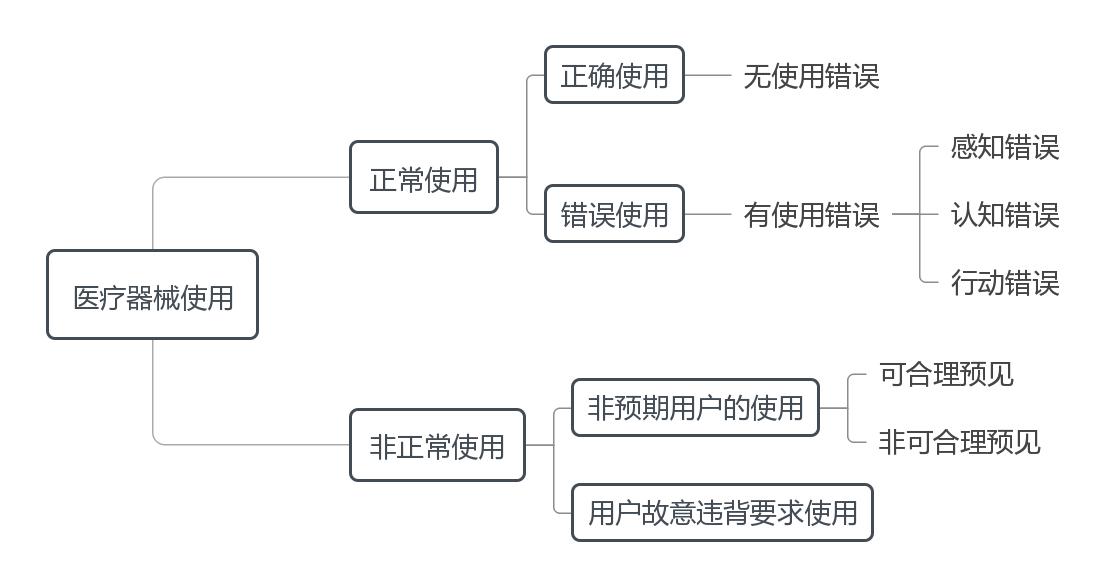 使用错误是指可能导致错误使用的潜在根源,可分为感知错误、认知错误和行动错误。其中,感知错误是指用户对视觉、听觉、触觉等信息感知失效所致的使用错误,如看错输出结果单位、未听到报警声音等;认知错误是指用户对知识、规则、信息存在记忆、理解等认知失效所致的使用错误,如漏记手术操作步骤、误解符号含义等;行动错误是指用户操作失误、不当等行动失效所致的使用错误,如按错控制按钮、按压力度不够而未激活等。因此,预期的正确使用无使用错误,非预期的正确使用存在使用错误。