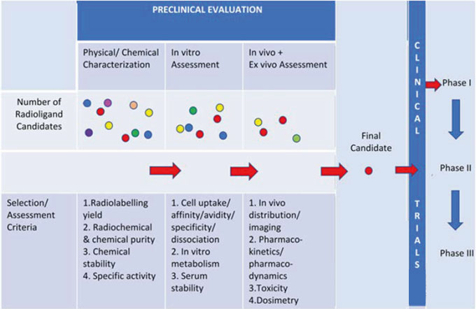 与传统药物开发路径类似,放射性治疗药物早期也会先进行体外研究包括理化表征、细胞吸收、亲和力、特异性、体外代谢、血清稳定性等,之后进行体内研究,并逐步确认候选分子,进入临床阶段。当然,放射性治疗药物也有其特别之处,从这类药物作用机理不难看出,其发挥药理学作用需要依赖某些组分将放射性核素靶向递送至特定组织(如肿瘤)的特定靶点。因此,药物在靶组织的蓄积、滞留时间、放射活性就比较重要,可以通过体内组织分布考察。另外,靶向递送分子的特异性决定了是否有脱靶毒性。而且,靶向递送分子有些是多肽或小分子,还要按照化药思路,考察体外肝细胞代谢,以评估种属差异。放射性核药开发过程示意图如下。