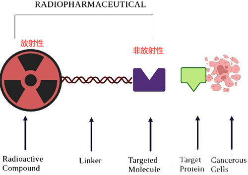 放射性治疗药物(Therapeutic radiopharmaceuticals)是将具有细胞毒性的放射性核素选择性地输送到病变部位,利用放射性核素的衰变特性释放射线或粒子,对病变细胞产生杀伤作用,从而达到治疗目的的一类药物。通常由放射性核素和非放射性部分组成。放射性核素是指能自发衰变并释放粒子或射线的不稳定核素。非放射性部分是指与放射性核素结合并将其递送至体内靶标部位的配体或载体,如多肽、蛋白、脂质体和小分子。简单示意图如下: