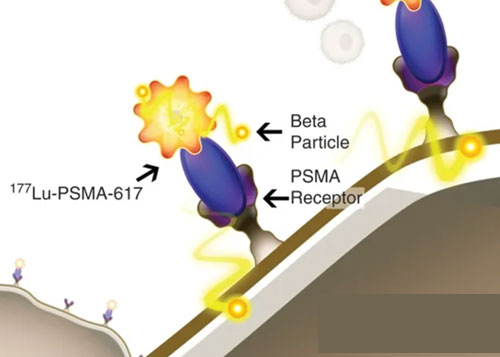 PSMA在前列腺癌细胞表面过表达,Pluvicto通过靶向PSMA的多肽配体,将177Lu递送至肿瘤部位,并形成杀伤,如下图所示。