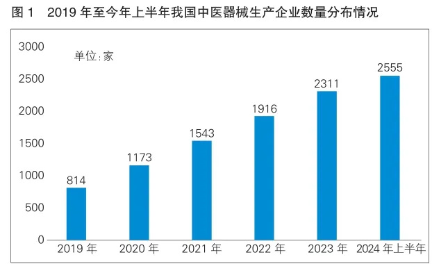 在政策红利持续释放的大背景下,中医器械行业驶入了发展的“快车道”。据统计,截至今年上半年,我国共有2555家中医器械生产企业,年复合增长率达29.81%。其中,生产Ⅰ类中医器械的企业数量增速最快,从2019年的662家迅速增长至今年上半年的2320家,年复合增长率高达33.65%。