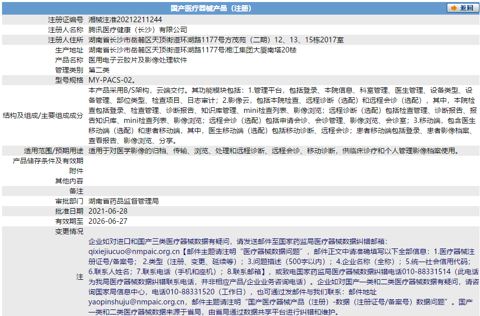 引言:飞速度通过药监总局官网获知,腾讯医疗健康(深圳)有限公司医疗软件类产品取得第二类医疗器械注册证。