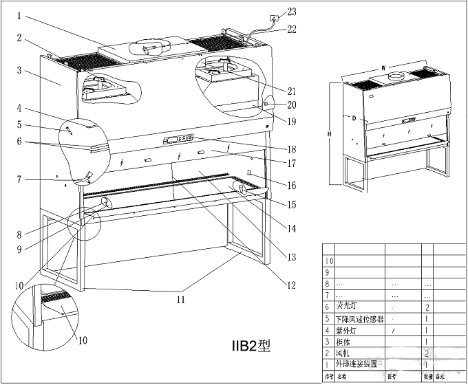 生物安全柜一般由柜体、风机、集液槽、过滤器、照明灯、控制面板、支撑脚及脚轮组成。应按照产品实际情况明确产品的结构及组成。