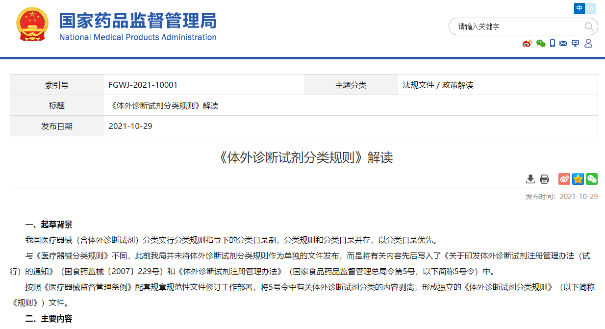 按照《医疗器械监督管理条例》配套规章规范性文件修订工作部署,将5号令中有关体外诊断试剂分类的内容剥离,形成独立的《体外诊断试剂分类规则》(以下简称《规则》)文件。