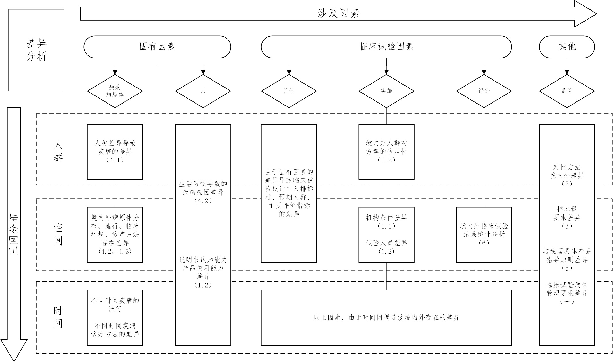 境内外临床试验数据的差异可能源于空间的差异、时间跨度的差异及人群的差异。申请人可参考本指导原则所述临床试验设计关键要素的思路,并结合附1“差异分析导图”所述路径,进行差异分析。