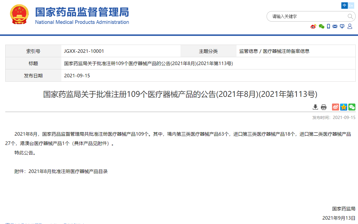 2021年8月,国家药品监督管理局共批准注册医疗器械产品109个。其中,境内第三类医疗器械产品63个,进口第三类医疗器械产品18个,进口第二类医疗器械产品27个,港澳台医疗器械产品1个