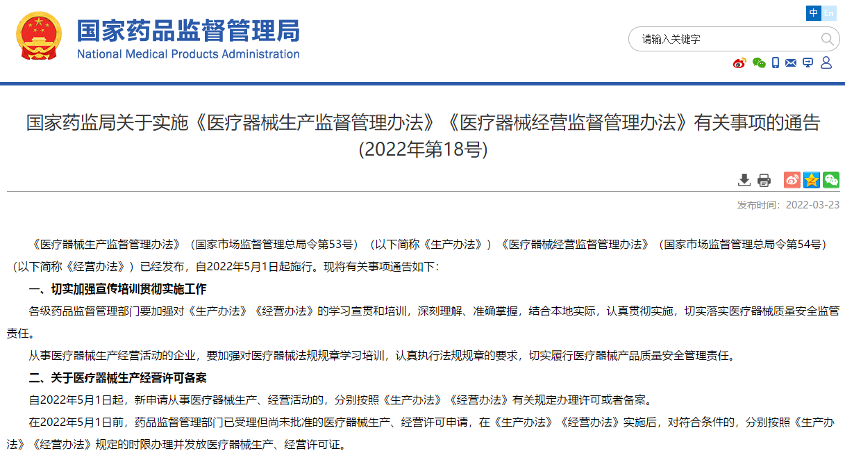 《医疗器械生产监督管理办法》(国家市场监督管理总局令第53号)(以下简称《生产办法》)《医疗器械经营监督管理办法》(国家市场监督管理总局令第54号)(以下简称《经营办法》)已经发布,自2022年5月1日起施行。现将有关事项通告如下: